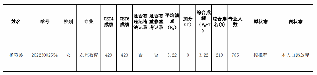 因农艺教育专业有一名学生主动放弃推免资格,现对主动放弃推免生资格的名单予以公示,具体见下表。