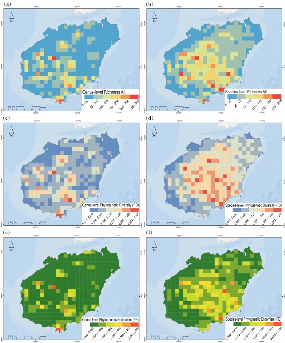 图1 海南本土植物的丰富度、系统发育多样性(PD)和系统发育特有性(PE)。(a) 属级丰富度;(b) 种级丰富度;(c) 属级系统发育多样性;(d)种级系统发育多样性;(e) 属级系统发育特有性;(f) 种级系统发育特有性。