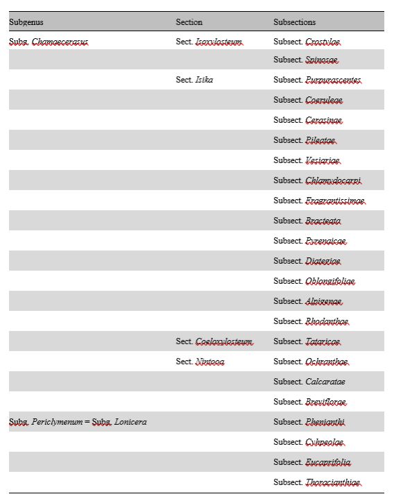 表2.Lonicera(忍冬属)各亚群的物种数量概述(根据Rehder,1903)。