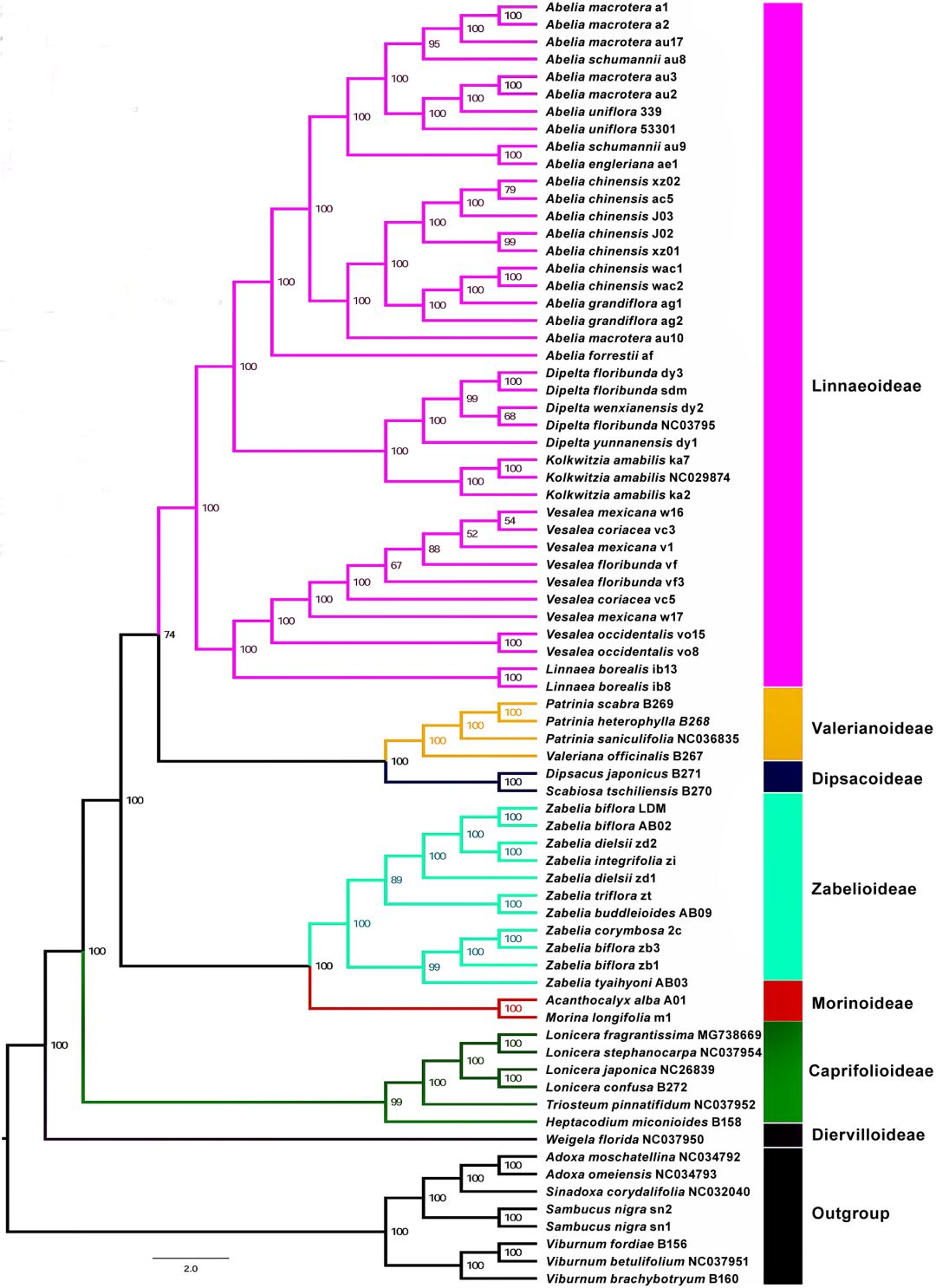 图1基于最大似然推断的全叶绿体基因组的忍冬科系统发育关系。在分支上面的值是最大似然引导支持概率。忍冬科的不同亚科由不同的颜色表示。