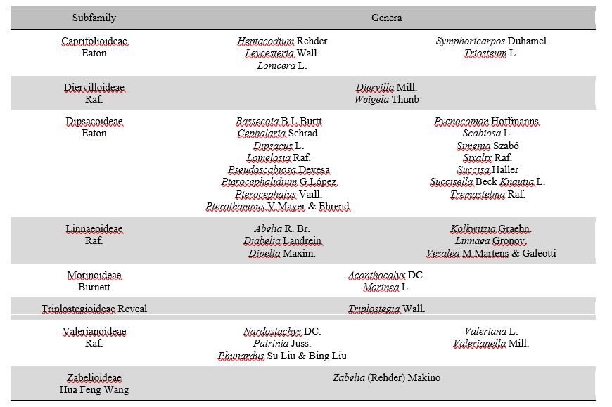 表1 忍冬科(Caprifoliaceae sensu APG IV)8个亚科及其对应属