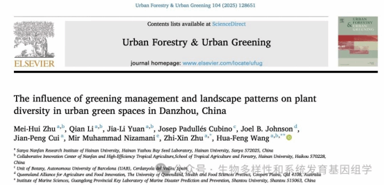 2024年12月,王华锋课题组在《Urban Forestry & Urban Greening》期刊(中科院一区TOP期刊,IF=6)发表题为“The Influence of Greening Management and Landscape Patterns on Plant Diversity in Urban Green Spaces in Danzhou, China”https://doi.org/10.1016/j.ufug.2024.128651的研究论文。yl88858永利集团硕士研究生朱美惠为该论文的第一作者,王华锋教授为论文的通讯作者。本研究得到国家自然科学基金的资助。