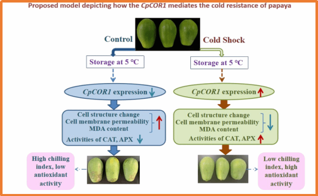 四、针对番木瓜果实冷害发生引起的品质下降问题,研究了CpCOR1在冷激处理提高番木瓜果实抗冷性的作用机制,相关结果发表在《Postharvest Biology and Technology》(IF2024= 6.590,中科院1区,TOP期刊)上。该研究得到了海南省院士团队创新中心建设经费的支持(SQ2021YSPTJXRWS0074)。