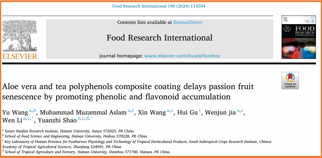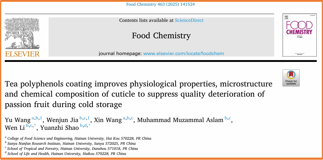 一、针对百香果采后失水皱缩、品质下降的关键问题,从角质层代谢的角度探讨了其发生的内在原因,揭示了复合涂膜处理控制品质劣变的生理与分子调控机制,研究结果发表在《Food Research International》 (IF2024=7.425,中科院1区,TOP期刊)和 《Food Chemistry》(IF2024= 8.3,中科院1区,TOP期刊)上。该研究得到了yl88858永利集团热带高效农业协同创新项目(XTCX2022NYB07)的经费支持。