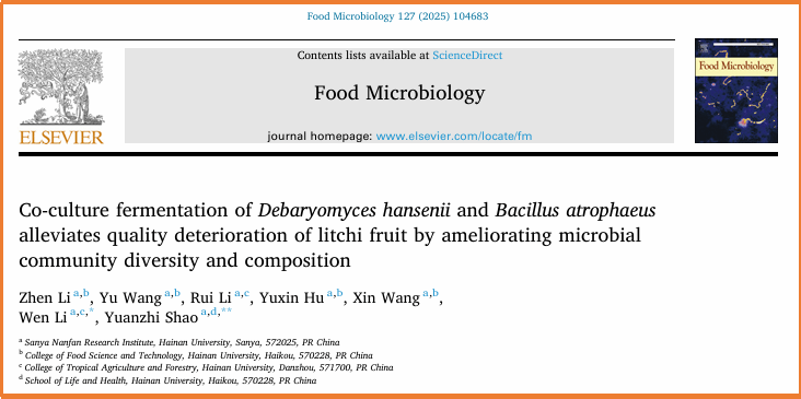 三、针对荔枝采后褐变和品质劣变问题,从微生物组学、转录组学等多角度揭示了拮抗菌处理即控制果皮褐变又能控制病害发生的调控机制,相关结果发表在在《Food Microbiology》 (IF2024= 5.3,中科院1区,TOP期刊), 《Postharvest Biology and Technology》(IF2024= 6.590,中科院1区,TOP期刊)和《Biological Control》(IF2024= 3.7,中科院1区,TOP期刊)上。该研究得到了国家自然科学基金面上项目(32272382)、海南省自然科学基金创新团队项目(320CXTD430)和海南省重点研发计划项目(ZDYF2022XDNY168)的经费支持。