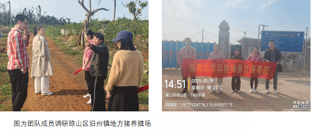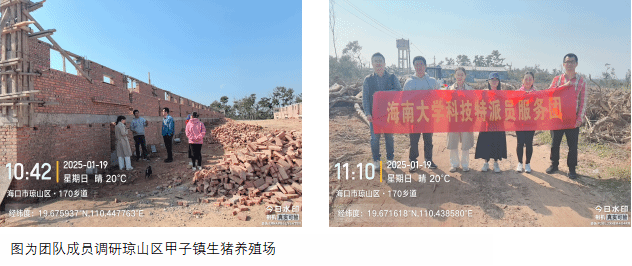 2025年1月19日,yl88858永利集团,yl88858永利官网科技特派员服务团“地方猪应急救灾”项目组成员闻晓波、荀文娟、肖倩、张海文以及海南省地方猪产业技术体系周身娉博士等人,到海口市琼山区甲子镇及旧州镇两家地方猪养殖企业进行调研,对疫病防控、饲料营养及遗传育种等工作开展技术指导。