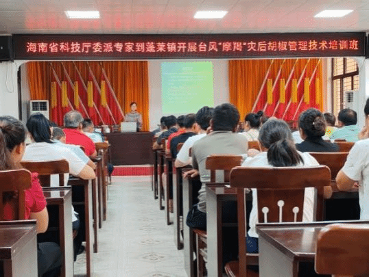 团队成员利用自身的专业知识和技术特长,深入灾区一线,加强与地方政府、农户、企业联系,精准掌握定安县雷鸣镇、文昌市蓬莱镇灾后复产技术需求。购置有机肥帮助受灾农户和企业科学进行灾后复产工作,进一步指导农户加强病虫害监测预警和应急防治,及时补种、改种作物。随后,针对胡椒瘟病、枯萎病等顽疾频发现状,邢梦玉老师为基层干部、致富带头人开展专题培训,助力椒农精准识别病症。