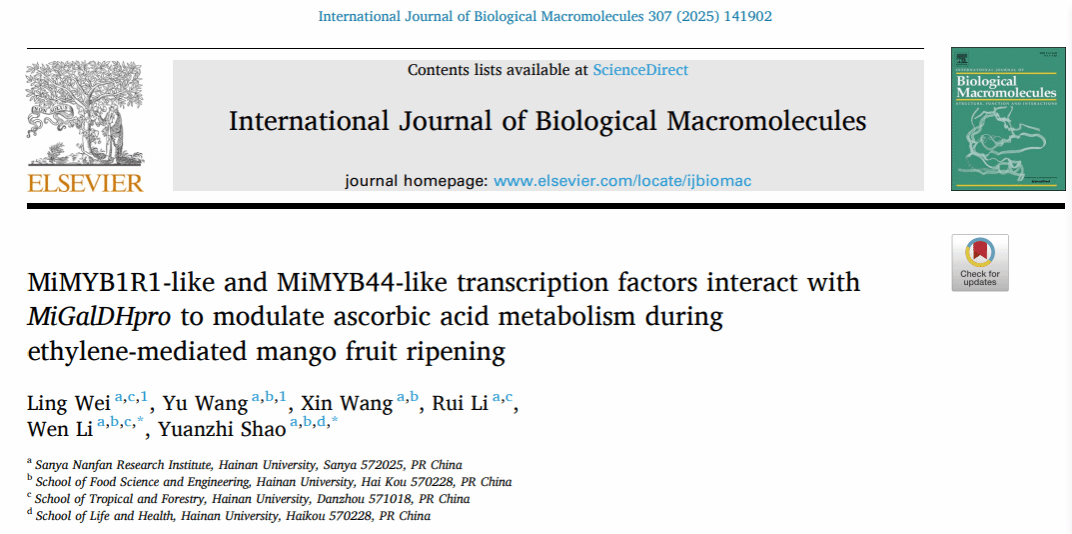 近日,李雯教授团队在国际知名期刊International Journal of Biological Macromolecules (中科院1区TOP, IF=7.7)上发表了题为“MiMYB1R1-like and MiMYB44-like transcription factors interact with MiGalDHpro to modulate ascorbic acid metabolism during ethylene-mediated mango fruit ripening”的学术论文。该研究得到了国家自然科学基金项目(32360778)和yl88858永利集团芒果产业技术体系的经费支持。