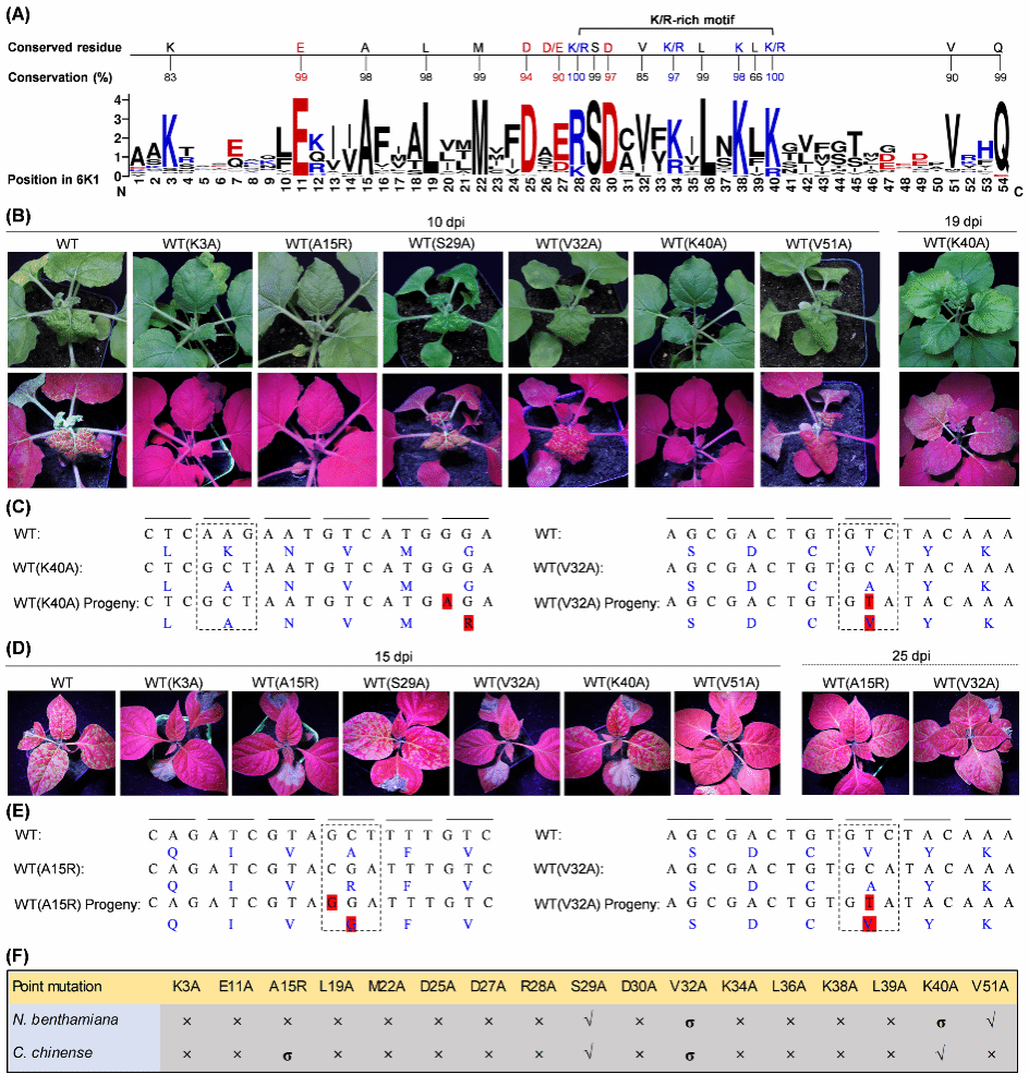 图2. PVMV 6K1蛋白包含的14保守氨基酸对病毒侵染至关重要。