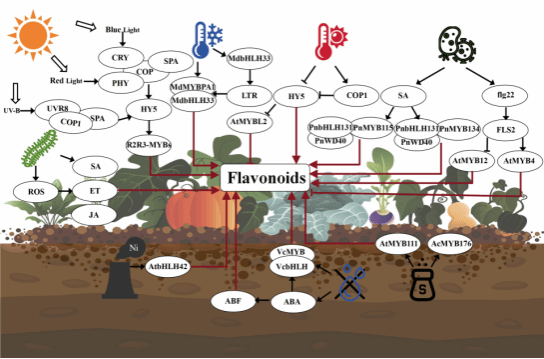 而类黄酮的合成,并不是随心所欲的。它们背后有一群精密的“调控大师”,包括转录因子、miRNA以及植物激素等。其中,MYB转录因子就像是总指挥,它们通过与DNA上的特定区域结合,精准地开启或关闭类黄酮合成基因的大门。而miRNA这些小分子RNA,则像是秘密特工,悄悄潜入细胞,通过剪切或抑制mRNA来微妙地调控类黄酮的合成量。此外,植物激素也根据环境的变化,灵活调整类黄酮的合成,确保植物在最佳状态下应对各种挑战。