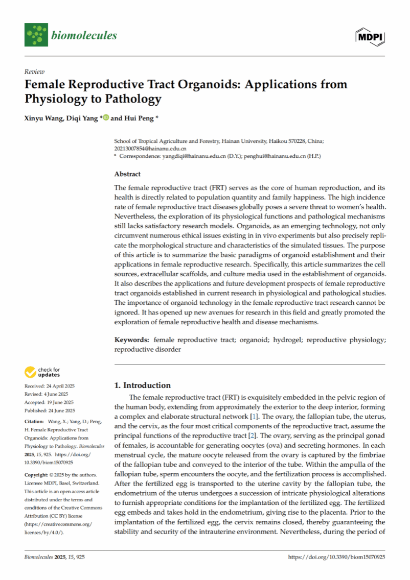 王欣雨撰写了题为《Female Reproductive Tract Organoids: Applications from Physiology to Pathology》的论文。该论文深入探讨了类器官这一革命性技术在雌性生殖系统研究中的应用。类器官作为一种体外三维培养模型,能够高度模拟卵巢、输卵管、子宫、子宫颈等组织的复杂结构和功能,有效规避了传统体内实验的伦理限制。论文系统总结了建立雌性生殖道类器官的关键要素,包括细胞来源、细胞外支架和培养基配方,并详细阐述了类器官在揭示生殖生理机制(如胚胎着床)、模拟病理过程(如子宫内膜异位症、癌症)以及药物筛选和再生医学中的巨大潜力。