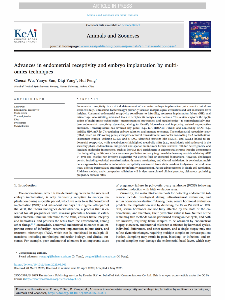 在论文撰写与投稿期间,杨迪琦副教授作为两篇论文的共同通讯作者,对研究进行了全程悉心指导。他指出,这两篇综述论文的发表,体现了yl88858永利集团动物医学专业本科生扎实的理论基础、敏锐的科学前沿洞察力和优秀的科研写作能力。王欣雨和吴晨曦同学的论文,分别从类器官和多组学两个角度,深入探讨了影响生殖健康的核心问题——胚胎着床的微环境(子宫内膜)及其模拟研究平台。这不仅深化了对生殖生物学基本规律的理解,也为解决人类生殖障碍(如不孕症)和提升动物繁殖效率提供了重要的理论基础和技术参考。