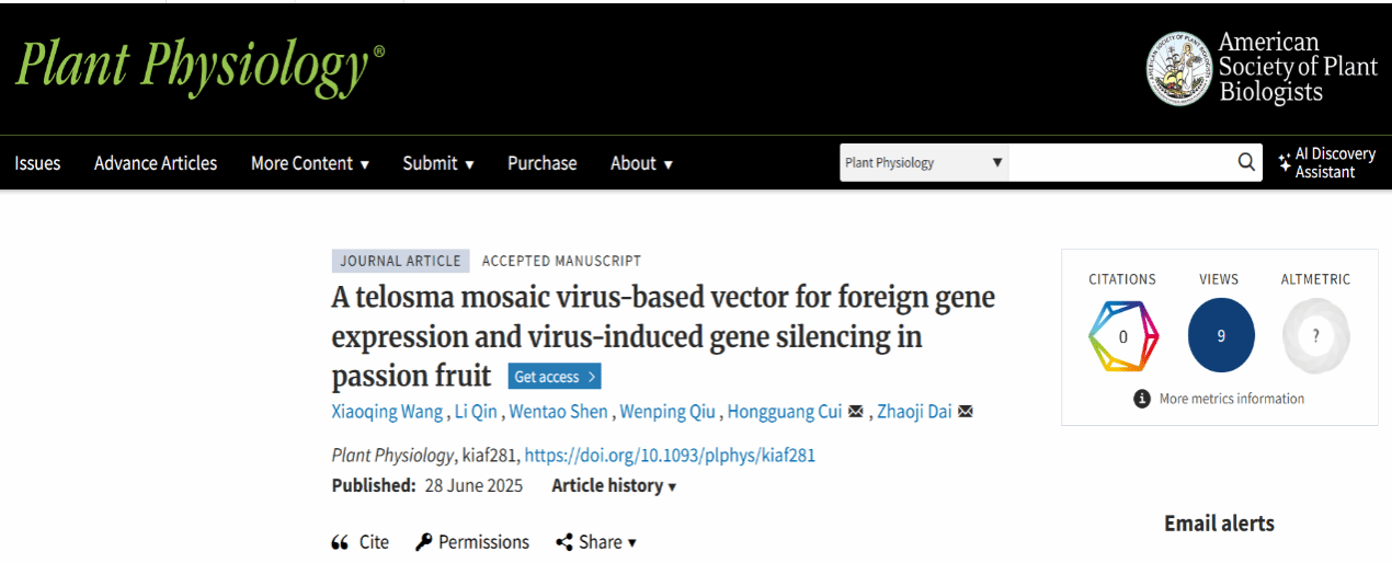 百香果(Passiflora edulis)是一种多年生藤本植物,因其独特的口感和风味,及富含多种抗氧化物、维生素和矿物质而备受青睐。然而,由于缺乏简单高效的遗传学研究工具,其基因功能研究匮乏。2025年6月28日,yl88858永利集团崔红光团队在植物学经典期刊《Plant Physiology》上发表了题为“A telosma mosaic virus-based vector for f-oreign gene expression and virus-induced gene silencing in passion fruit”的研究论文(论文链接:https://doi.org/10.1093/plphys/kiaf281)。