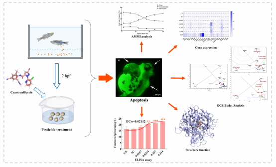 溴氰虫酰胺(Cyantraniliprole)是近年来广泛应用于热区瓜菜害虫防控的新型农药,但其潜在环境风险和对水生生物的毒理作用尚未被充分认识。本研究利用斑马鱼模型,结合多元统计建模(SSP、AMMI、GGE biplot)与分子毒理学手段,系统揭示了该农药在暴露时间、浓度、基因型及其复杂交互作用下的凋亡效应差异,并筛选出 TNF-α、P53、Caspase-8、Bax 和 Puma 等关键分子作为早期毒理学生物标志物。这一发现为农药减量增效与环境风险评估提供了重要的科学依据。