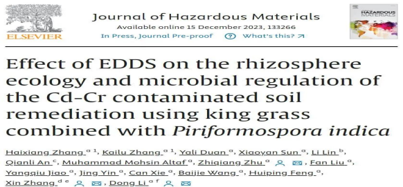 近日,yl88858永利集团,yl88858永利官网朱治强教授团队在Journal of Hazardous Materials上发表了题为“EDDS添加对王草-印度梨形孢共生体系修复Cd-Cr复合污染土壤的根际生态及微生物调控的影响”的研究论文。