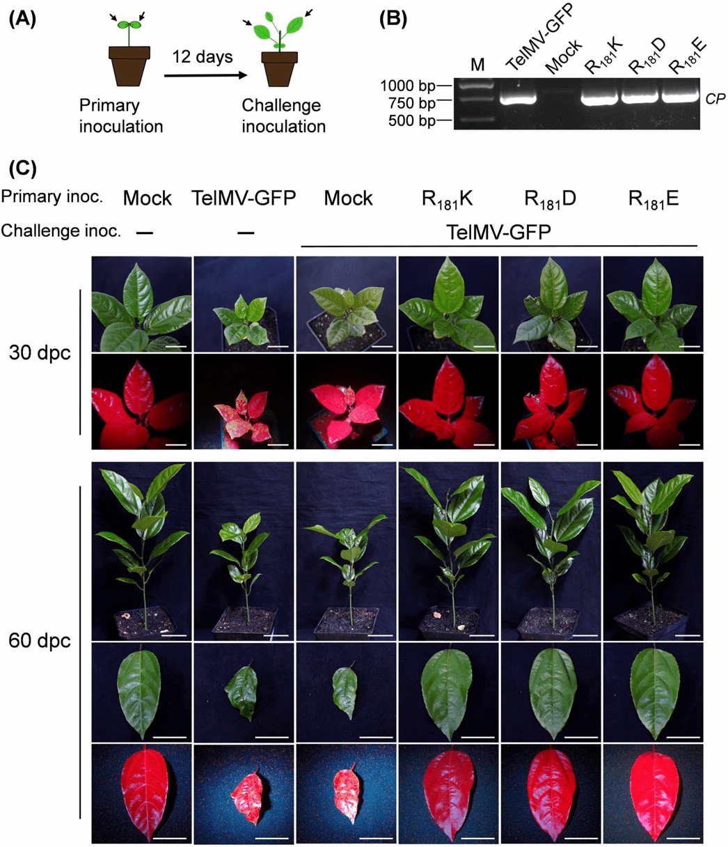 团队前期首次克隆和注释了TelMV百香果分离株全基因组序列(Yang et al., 2018, Arch Virol),成功构建了TelMV的反向遗传学操作体系(Gou et al., 2023, J Virol)。本研究通过比对分析马铃薯Y病毒属(Potyvirus)中143种病毒的多功能蛋白HCPro氨基酸序列,筛选到保守的第181位的精氨酸(R181)位点。将R181分别突变为赖氨酸(K)、天冬氨酸(D)、谷氨酸(E)后获得三个弱毒突变体R181 K、R181 D、R181 E,这三个弱毒突变体在百香果植株中能系统侵染但不表现症状,且均可有效预防随后野生型TelMV的侵染(图1)。通过3次间隔20天的连续传代后,这三个突变体的基因组序列保持不变,说明在遗传上稳定。本研究获得的具有交叉保护作用且稳定的弱毒突变体为百香果的生产提供了一种有效的防控手段。