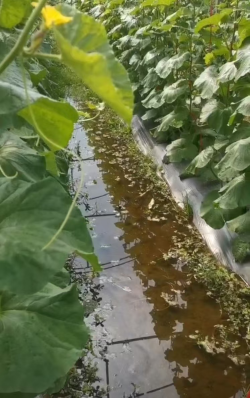 邢梦玉副教授根据不同瓜园的实际情况,指导挖深沟排水或抽水机抽水以尽快降低水位,同时讲解了水位下降后要尽快促根、养根和防治土传病害的综合管理方法(图3、图4、图5)。