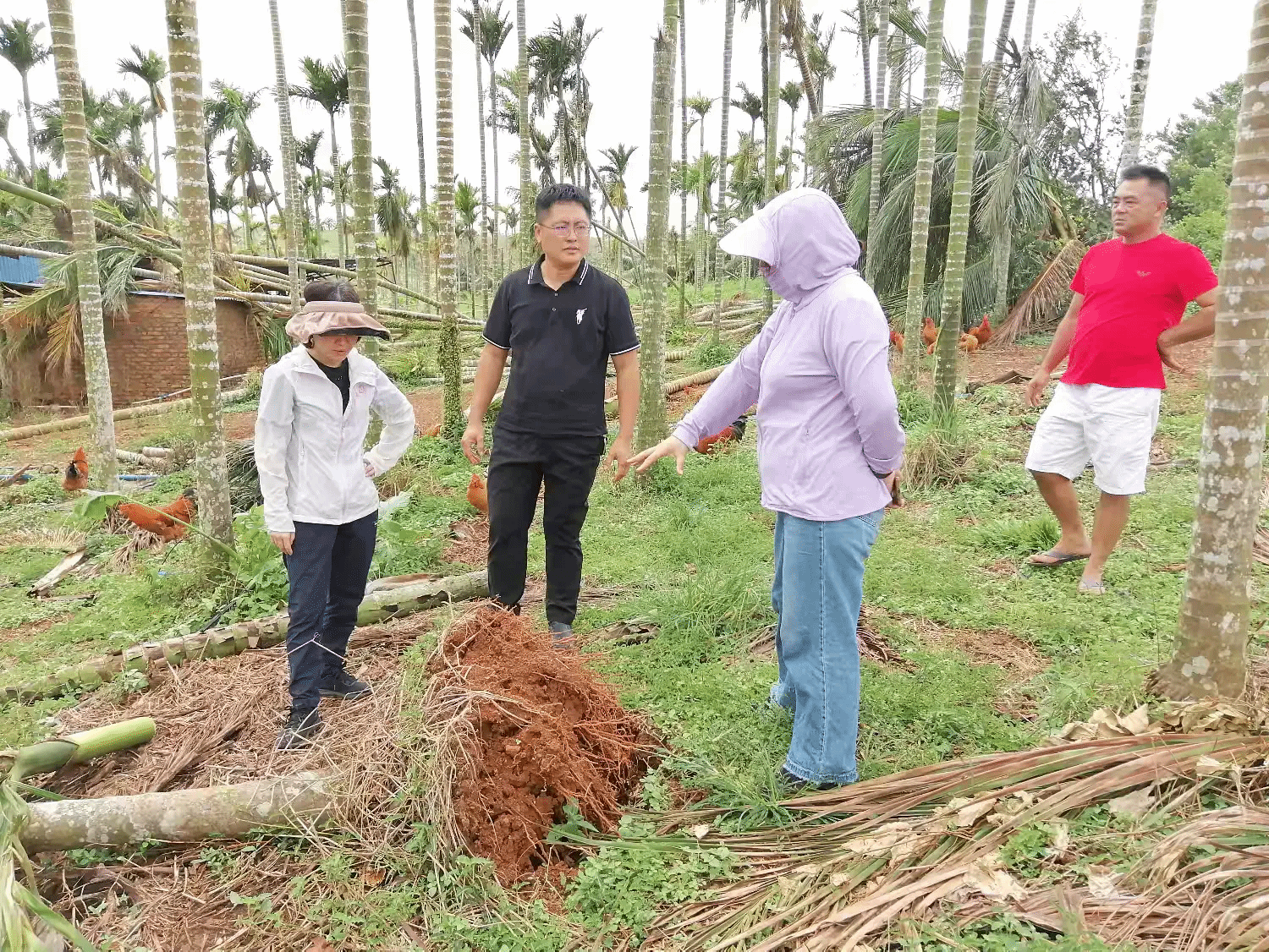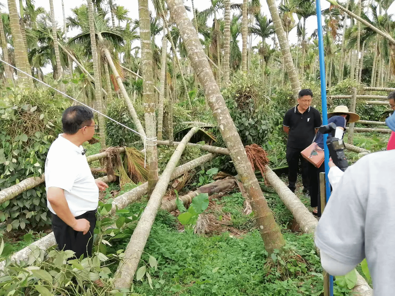 目前,农户们都在积极开展抗风救灾工作。其中,南阳高隆村槟榔种植大户,种植基地的槟榔树存在大批量倾斜倒伏情况;胡椒种植基地中,大量胡椒植株叶片严重脱落、枝条出现回枯现象;蔬菜基地大棚全部损毁;南阳山城村奇楠沉香种植基地已割开的沉香几乎全部断裂倒伏、沉香苗断枝倾斜,目前正在开展修整扶正工作;潭牛镇美文居胡椒种植基地的植株落叶严重、枝条回枯脱落。