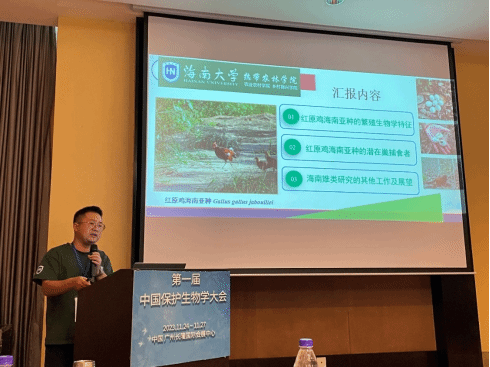 我院教师饶晓东博士以《红原鸡海南亚种(Gallus gallus jabouillei)的繁殖生态及其潜在巢捕食者》为题做了分会场报告。饶晓东老师主要概括了海南雉类的保护与研究现状,对其最新研究成果“红原鸡海南亚种的繁殖生态”做了重点介绍,并对课题组在海南雉类的其他研究进行了总结和展望。最后,饶老师呼吁大家关注热带雨林旗舰物种海南孔雀雉(Polyplectron katsumatae)、海南山鹧鸪(Arborophila ardens)等特有鸟类及其栖息地的保护与管理,并邀请各领域专家参与海南热带雨林国家公园和其他自然保护地的建设。