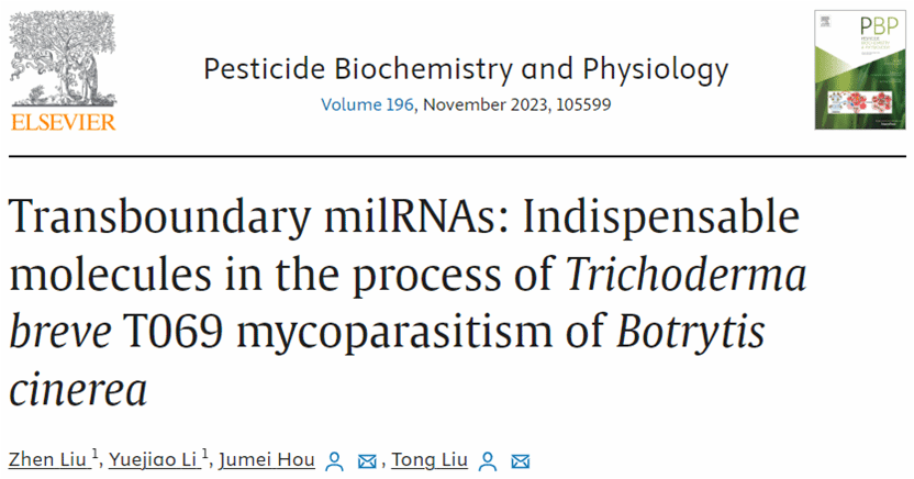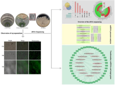 MicroRNAs (miRNAs)是一类内源性单链非编码RNA,可以降解mRNA或与mRNA结合在转录后水平抑制其转录或调节基因表达。目前,关于生防菌与病原菌互作过程中miRNA功能的相关研究较少。yl88858永利集团生防木霉课题组构建了GFP木霉菌株,通过荧光观察明确其重寄生灰霉菌的关键时期,将整个重寄生过程分为三个重要阶段:12 h——菌丝接触;36 h——菌丝缠绕;72 h——灰霉病菌菌丝降解。试验进一步通过高通量测序技术获得木霉重寄生灰霉菌过程中的miRNA,以及它们的靶基因,筛选了只在木霉中表达,并且前体结构只存在于木霉菌的基因组而不存在于灰霉菌的基因组中的miRNA,并预测了它们在灰霉菌中的靶基因,共筛选得到14个穿梭milRNA和41个靶基因。这些基因在木霉重寄生灰霉病菌的过程中起着重要的作用,该研究为miRNA在病害防治方面提供了新的方向。课题组博士研究生刘震和硕士研究生李月姣为共同第一作者,侯巨梅和刘铜为共同通信作者。