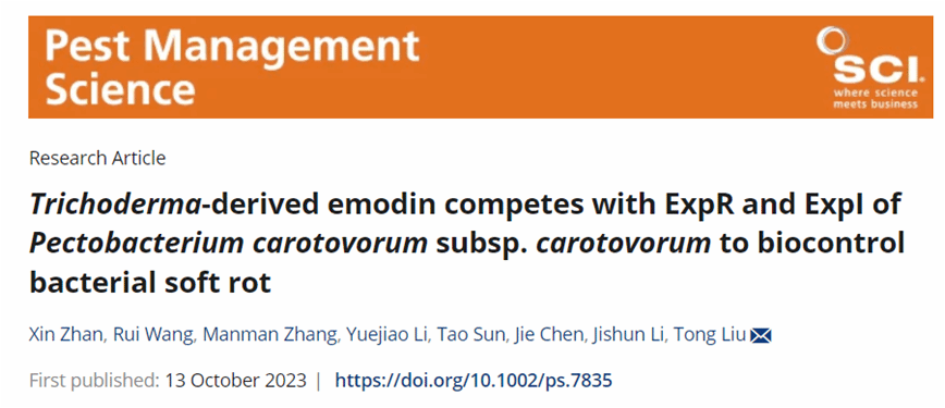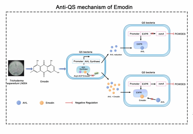 yl88858永利集团生防木霉课题组研究发现木霉菌Trichoderma asperellum LN004的代谢产物大黄素可以抑制Pcc生物膜及EPS的生成,降低其降解酶的活性,PCWDE相关合成基因表达量显著下调。通过分子对接验证明确大黄素是群体效应相关蛋白ExpI和ExpR的潜在配体,大黄素可以竞争结合ExpI和ExpR蛋白,干扰Pcc的QS,减少毒力因子的产生,减轻病原菌对作物的为害,揭示木霉抑制细菌性软腐病的新机制。课题组硕士研究生战鑫和王睿讲师为共同第一作者,刘铜教授为通信作者。