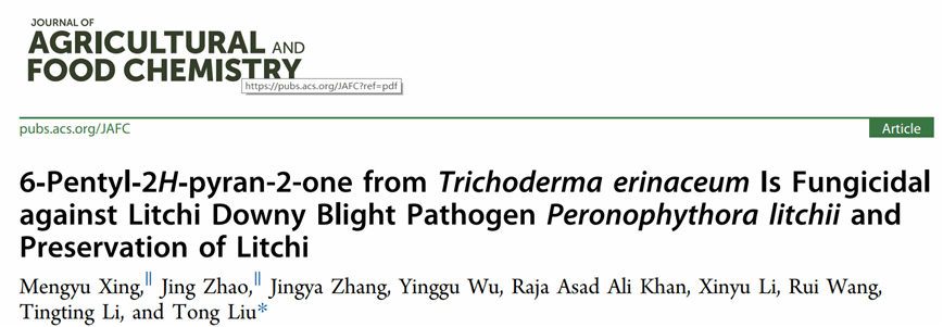 荔枝霜疫病是目前荔枝生产及贮运过程中非常严重的病害,贮运期间只要有少数几个果实携带病菌便可使附近果实全部发病,从而导致大量果实腐烂变质,造成严重经济损失。yl88858永利集团生防木霉课题组研究发现猬木霉LS019-2对荔枝霜疫霉菌丝生长抑制率最高,其中挥发性化合物6-戊基-2H-吡喃-2-酮(6PP)为主要抑菌物质,6PP显著抑制荔枝霜疫霉菌丝生长、孢子囊萌发、严重破坏菌丝体的超微结构,阻碍病害的发展。同时,在保鲜过程中能保持较好的果皮色泽、增强抗氧化物酶活性、富集氨基酸、减缓失重,从而延长了荔枝的货架期。因此,天然挥发性物质6PP既可以作为杀菌剂同时也是一种新型果实防腐保鲜剂用于荔枝的生产中。该论文为Journal of Agricultural and Food Chemistry封面文章(2023, Volume 71)。课题组邢梦玉副教授和赵晶讲师为共同第一作者,刘铜教授为通信作者。