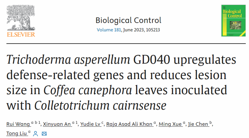 由炭疽菌(Colletotrichum spp.)引起的咖啡炭疽病是一种生产中极易发生和传播的重要害,已成为影响咖啡高产量的主要生物限制因素之一。使用化学农药对咖啡炭疽病的防效不佳。yl88858永利集团生防木霉课题组首次报道了Colletotrichum cairnsense可侵染咖啡并引发咖啡炭疽病。通过筛选得到一株对C. cairnsense具有良好拮抗作用和重寄生能力的棘孢木霉GD040。盆栽实验表明用棘孢木霉GD040孢子悬浮液灌根处理后可以显著减少C. cairnsese侵染导致的咖啡叶病斑面积。转录组分析和qRT-PCR结果证明,C. cairnsense接种咖啡叶片后会抑制抗性基因的表达,而棘孢木霉GD040可诱导咖啡NB-ARC和LRR结构域编码基因以及与苯丙烷生物合成途径相关的基因的上调表达,并激活JA/ET和SA途径以触发SAR和ISR抵抗C. cairnsese侵染。此外,棘孢木霉GD040处理后咖啡的生长素合成基因和赤霉素合成基因表达水平也显著上调。此研究从分子水平揭示了棘孢木霉GD040对C. cairnsense的拮抗模式和多途径诱导咖啡寄主对炭疽病抗性的机制,为开发多功能木霉生物制剂及其在咖啡炭疽病防治中的应用奠定了基础。课题组王睿讲师及硕士研究生安馨媛为共同第一作者,刘铜教授为通信作者。