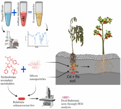 yl88858永利集团生防木霉课题组利用硅、木霉代谢物合成的纳米硅和木霉代谢物处理对番茄在金属镉和细菌性枯萎病菌胁迫下的响应变化,发现木霉代谢物合成的纳米硅和木霉代谢物可以提高植物对镉的耐受性,降低从土壤中转运镉的能力进而减少植物体内镉含量,增强植物光合作用、抗氧化酶活性来降低镉的毒性。同时,木霉代谢物合成的纳米硅和木霉代谢物联合施用可以破坏青枯劳尔氏菌体细胞结构,显著降低番茄细菌性枯萎病的发生。课题组博士后Raja Asad Ali Khan为第一作者,刘铜教授为通信作者。