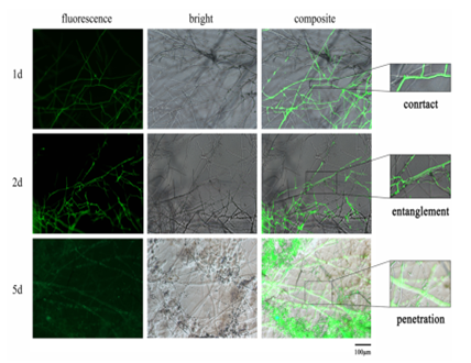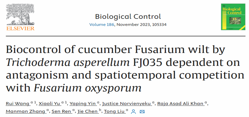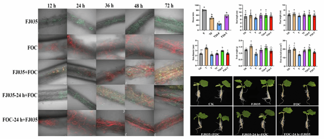 黄瓜枯萎病是一种由尖孢镰孢菌黄瓜专化型(Fusarium oxysporum f. sp. cucumerinum Owen,FOC)引起的全球性土传病害,在黄瓜整个生长季均能侵染,对全球黄瓜产量造成了严重的损失。yl88858永利集团生防木霉课题组筛选出对FOC具有良好拮抗作用的棘孢木霉FJ035,该菌株可有效抑制FOC的孢子萌发,且提高了黄瓜种子的发芽潜力。进一步通过荧光标记结合显微观察技术对棘孢木霉FJ035与FOC在黄瓜根际的时空竞争进行了动态监测。结果表明棘孢木霉FJ035与FOC孢子悬浮液同时处理黄瓜根部时,FOC孢子可迅速在根部富集和萌发,而棘孢木霉对FOC的抑制效果较弱;当接种FOC孢子悬浮液前24 h用棘孢木霉FJ035孢子悬浮液处理,可显著减少FOC孢子在黄瓜根部的积累,且其孢子的萌发也受到抑制。水培和盆栽条件下对黄瓜枯萎病的最高防治效率分别为69.79%和75.96%,同时棘孢木霉FJ035还有效的减轻FOC对黄瓜生长的不利影响。因此,棘孢木霉FJ035作为预防性生物制剂使用效果最佳。该研究描述了棘孢木霉FJ035与FOC在黄瓜根际的时空竞争关系,为探索木霉的生防机制和指导其在生产中的应用提供了理论依据。课题组王睿讲师和硕士研究生于笑丽为共同第一作者,刘铜教授为通信作者。