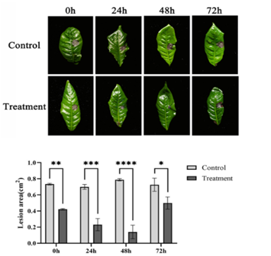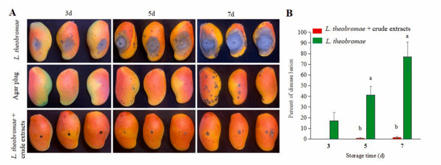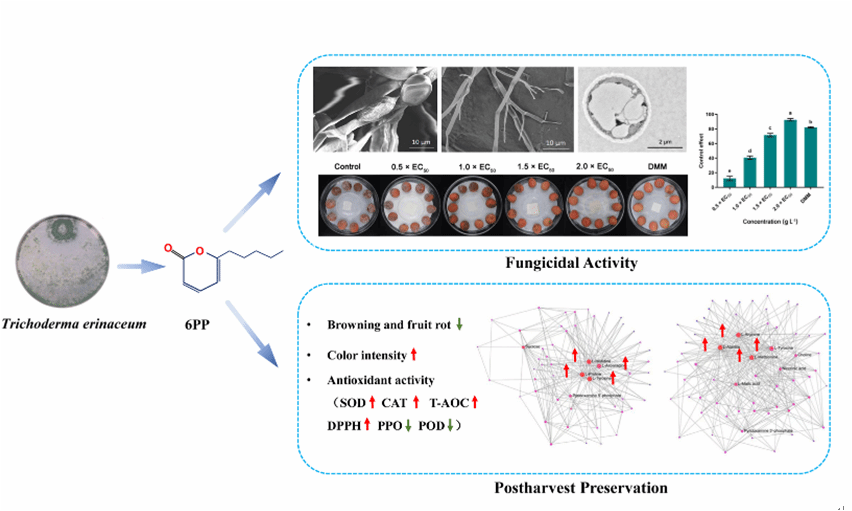 芒果蒂腐病是由Lasiodiplodiatheobromae引起的一种破坏性的采后病害,严重危害采摘后的芒果生产。yl88858永利集团,yl88858永利官网生防木霉科研团队研究发现羽状木霉Trichoderma pinnatumLS029-3非挥发性代谢物对病原菌的抑制作用最强,代谢液粗提物的EC50为0.25 ± 0.03 g L−1,扫描电镜表明经4倍EC50粗提物处理后的菌丝结构被破坏,代谢液粗提物可以显著减少病斑面积和腐烂病的发生。通过增加防御酶活性,提高果实清除活性氧的能力,增强果皮硬度和色泽,减缓果实腐烂。本研究为芒果蒂腐病采后防治提供了一种安全有效的生物防治策略。课题组硕士研究生战鑫和博士后Raja Asad Ali Khan为共同第一作者,刘铜教授为通信作者。