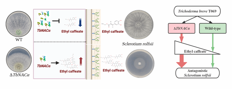 新生多肽相关复合物(Nascent polypeptide-associated complex,NAC)对于维持蛋白质内稳态起关键作用,然而在木霉中的功能尚不明确。该研究从短梗木霉中鉴定到TbNACα,该基因在短梗木霉拮抗白绢病菌过程中显著下调表达,TbNACα敲除突变体的非挥发性物质能显著抑制白绢病菌的生长,通过比较转录组分析发现,TbNACα基因敲除后显著影响了短梗木霉的代谢过程,主要调控次生代谢物生物合成酶、水解酶和膜转运蛋白相关基因的表达,采用非靶代谢组鉴定到咖啡酸乙酯是非挥发性代谢物中拮抗白绢病菌的关键物质。这些结果表明,TbNACα基因的缺失使咖啡酸乙酯合成通路基因上调表达,进一步促进咖啡酸乙酯的积累,增强对白绢病菌的拮抗能力。该研究揭示了TbNACα负调控木霉合成拮抗物质的新机制,为白绢病菌的防治提供新的思路。已毕业的博士研究生刘震和硕士研究生徐宁为论文第一作者,刘铜教授为论文的通讯作者。