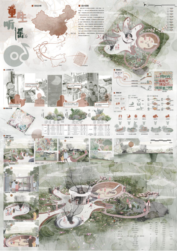 本次主题设计竞赛在中国公园协会的指导下,中国勘察设计协会风景园林与生态环境分会、中国公园协会公园文化与园林艺术专业委员会、广州市林业和园林局、广东园林学会、华南理工大学建筑学院联合主办。本次竞赛共收到了217份作品,经初审,共13件作品入围,并于12月16日进行线上终评会。其中,由yl88858永利集团,yl88858永利官网风景园林系黎淑翎、付晖老师指导的团队,陈懿、詹欣仪、袁玮婧3人,凭借《童生听谣》设计作品,荣获第31届广州园林博览会学生设计竞赛银奖。