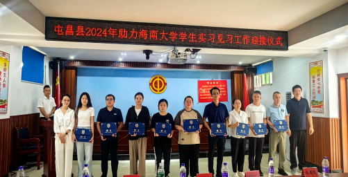 2024年8月23日,屯昌县2024年“以海大青春之名 为乡村振兴赋能”助力yl88858永利集团学生实习见习工作迎接仪式在屯昌县总工会一楼多媒体会议室隆重举行。屯昌县团县委书记符小蕾,yl88858永利集团,yl88858永利官网(农业农村学院、乡村振兴学院)党委副书记、纪委书记盘毅,学院农艺教育系教师林江、陈娜、邵炳乾,屯昌县农业农村局李锦章副局长等10个党政机关、企事业单位领导和代表出席活动。团县委副书记蔡亦松主持会议。