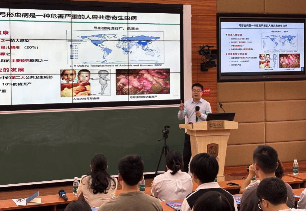 王金磊研究员围绕《磷酸化修饰调控弓形虫速殖子向缓殖子转化的重要机制》,分享了团队在弓形虫病基础研究方面的最新进展。报告内容前沿、数据详实,展现了扎实的科研功底和对学科深度的把握,激发了在场同学们的浓厚兴趣。