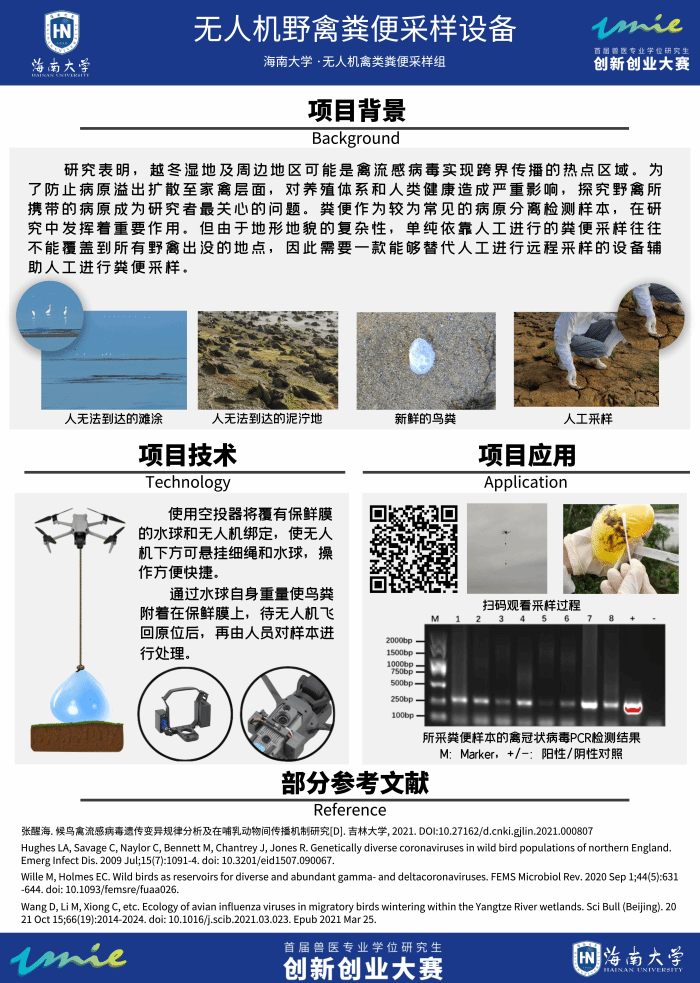 研究表明,越冬湿地及周边地区可能是禽流感病毒实现跨界传播的热点区域。为了防止病原溢出扩散至家禽层面,对养殖体系和人类健康造成严重影响,探究野禽所携带的病原成为研究者最关心的问题。禽类粪便作为较为常见的病原分离检测样本,在研究中发挥着重要作用。但由于地形地貌的复杂性,单纯依靠人工进行的禽类粪便采样往往不能覆盖到所有野禽出没的地点,本次参赛的这款无人机采样设备使用空投器将覆盖有保鲜膜的水球和无人机绑定,使无人机下方可悬挂细绳和水球。通过水球自身重量使鸟粪附着在保鲜膜上,待无人机飞回原位后,再由工作人员对样本进行处理。该作品是无人机在兽医科研领域的大胆尝试,体现了我院兽医专硕研究生在科研工作中积极创新、勇于实践的精神。本次大赛获奖也是对我校兽医专业学位研究生培养质量一次很好的检验和肯定。