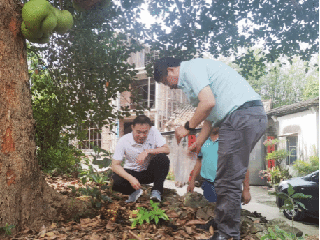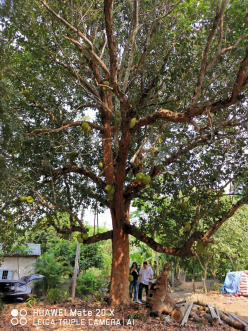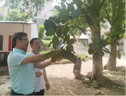 2024年4月18日,yl88858永利集团,yl88858永利官网党委书记兼菠萝蜜种子资源选育岗科学家于旭东老师、yl88858永利集团菠萝蜜产业技术体系骆焱平老师及1名研究生一同赴儋州市侨植农场调研菠萝蜜资源分布情况,意外发现一株50余年的菠萝蜜树(图1)。据当地村民介绍,该树是许树培先生最早栽培的2棵树之一,一颗栽种在侨植农场三队,一株栽种在八一农场。